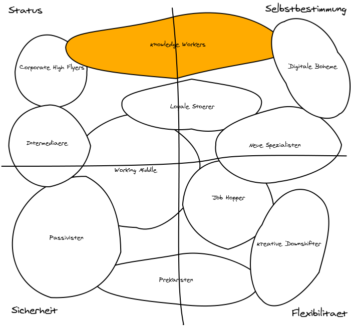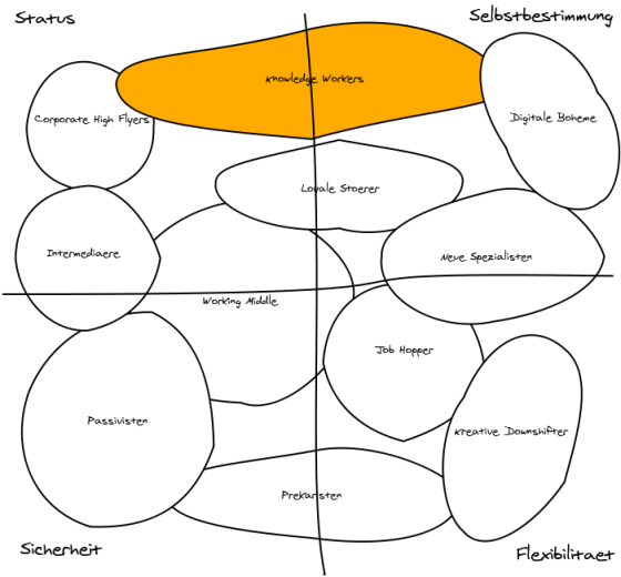 Alle 11 Arbeitertypen sind in der Online-Ausgabe von CIO kurz aber gut verständlich beschrieben. Interessant ist der Wissensarbeiter (Knowledge Worker), der sich in der Mitte gleichmässig über Status und Selbstbestimmung ausbreitet. Status heisst bei Wissensarbeitern immer die Anerkennung als Experte und erfolgreicher Problemlöser sowohl innerhalb des Unternehmens als auch ausserhalb. Die Selbstbestimmung erreichen Wissensarbeiter vor allem dadurch, dass der Problemlöseprozess kognitiv höchst individuell ist und dadurch zumindest temporär der Wissensbeiter sein eigener Manager ist.