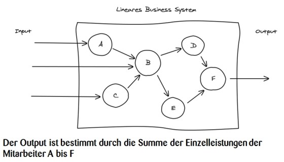 Was läuft da nun falsch? Welches Denkmodell sitz immer noch in den Köpfen der allermeisten Manager? Es ist das Modell einer Maschine, deren Elemente = Mitarbeiter linear zum Gesamterfolg des Unternehmens beitragen.