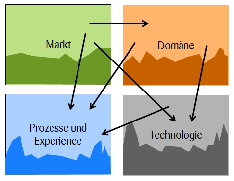 In unserem Buch Software entwickeln mit Verstand haben wir die Wissensbereiche in vier Felder eingeteilt (siehe Grafik). Ein Team startet ein Projekt mit bestimmtem Wissen aber auch mit Wissenslücken in jedem der vier Bereiche. Dazu kommt, dass die Bereiche untereinander Abhängigkeiten besitzen, die bei grossen Wissenslücken zunächst gar nicht bekannt sind. Wenn ich zum Beispiel den Markt für mein Produkt nicht gut kenne, dann kenne ich auch die Abhängigkeiten zu User Experience und fachlicher Domäne nicht. Und wenn ich zu wenig über User Experience weiss, dann kann ich auch nur schwer die passende GUI-Technologie oder das Design auswählen.