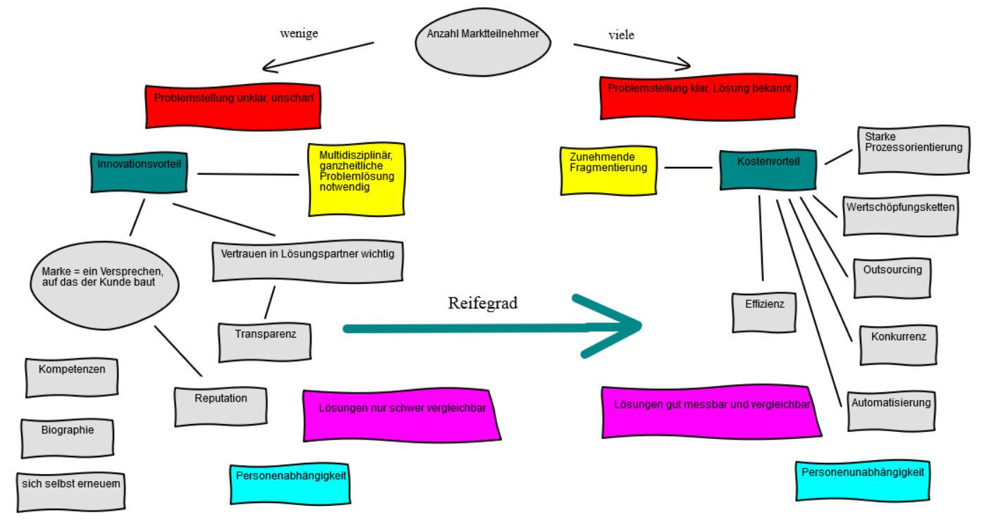 Man erkennt sehr schnell eine Zweiteilung der Arbeitsgesellschaft. Diejenigen, die unscharf formulierte Probleme lösen und diejenigen, die sehr klare Problemstellungen bearbeiten oder gar Routinearbeit ausführen. Unscharfe Problemstellungen erfordern Innovation, gemeinsames und oft interdisziplinäres Problemlösen und die Lösungen sind eher schwierig zu vergleichen. Hier spielt der Wert bzw. der Nutzen der Lösung bei der Lösungsauswahl eine grössere Rolle als der Preis. Aus klaren Problemstellungen resultieren meistens auch sehr gut vergleichbare Lösungen. Der Wert, den diese Lösungen für einen Kunden darstellen, ist bei allen Lösungsvorschlägen für ein bestimmtes Problem ungefähr gleich. Daher fokussiert ein Kunde auch mehr darauf, wie er den Nutzen zum bestmöglichsten Preis bekommen kann, besonders weil auch die Anzahl der Marktteilnehmer auf der rechten Seite in der Regel viel grösser ist.